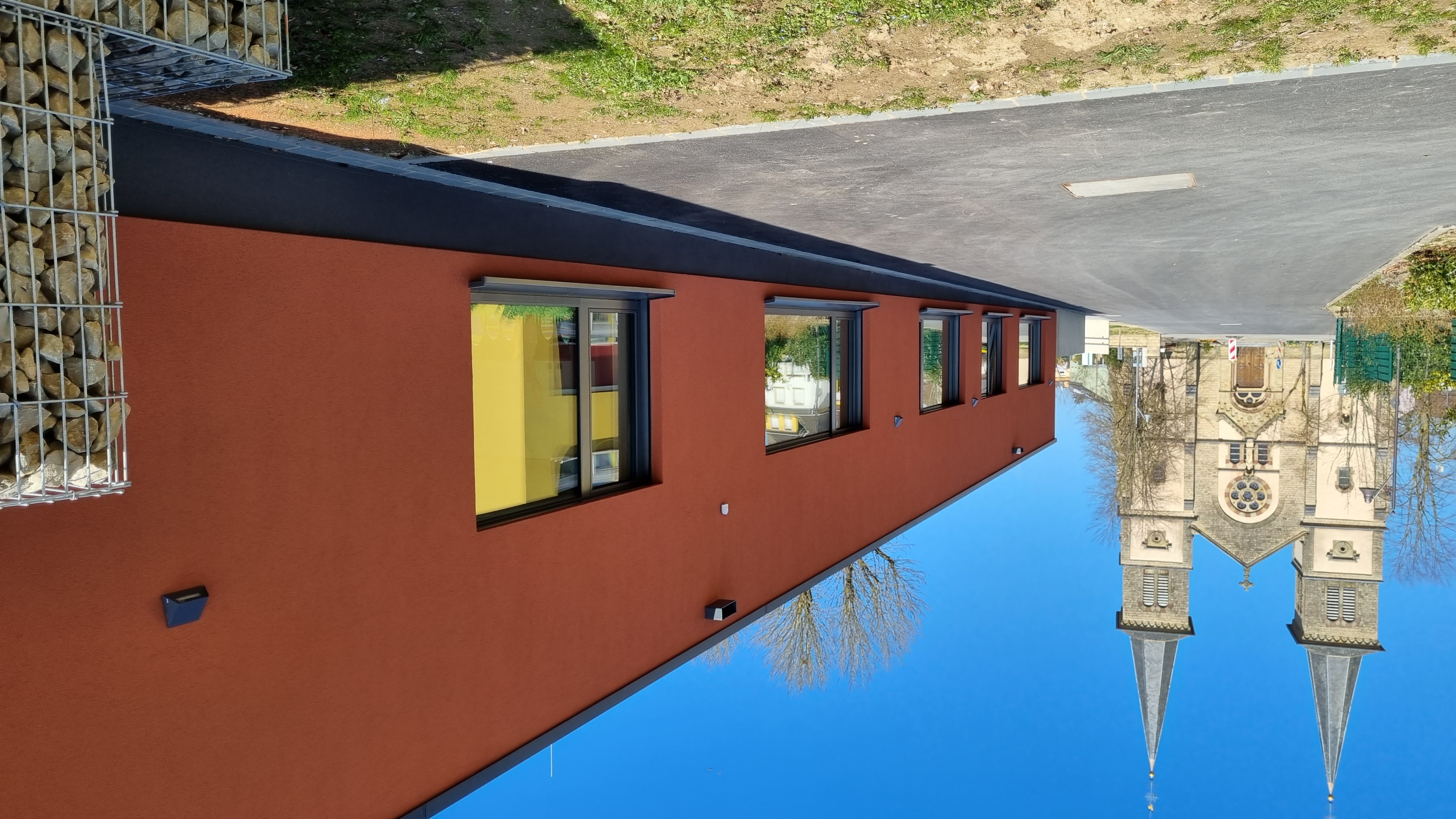 Les façades en bois et laine minérale répondent aux critères écologiques et garantissent, de part leur complexe, une isolation extérieure optimale. Le toit principal sur l’étage est équipée de panneaux photovoltaïques, les toitures du rez-de-chaussée sont végétales.